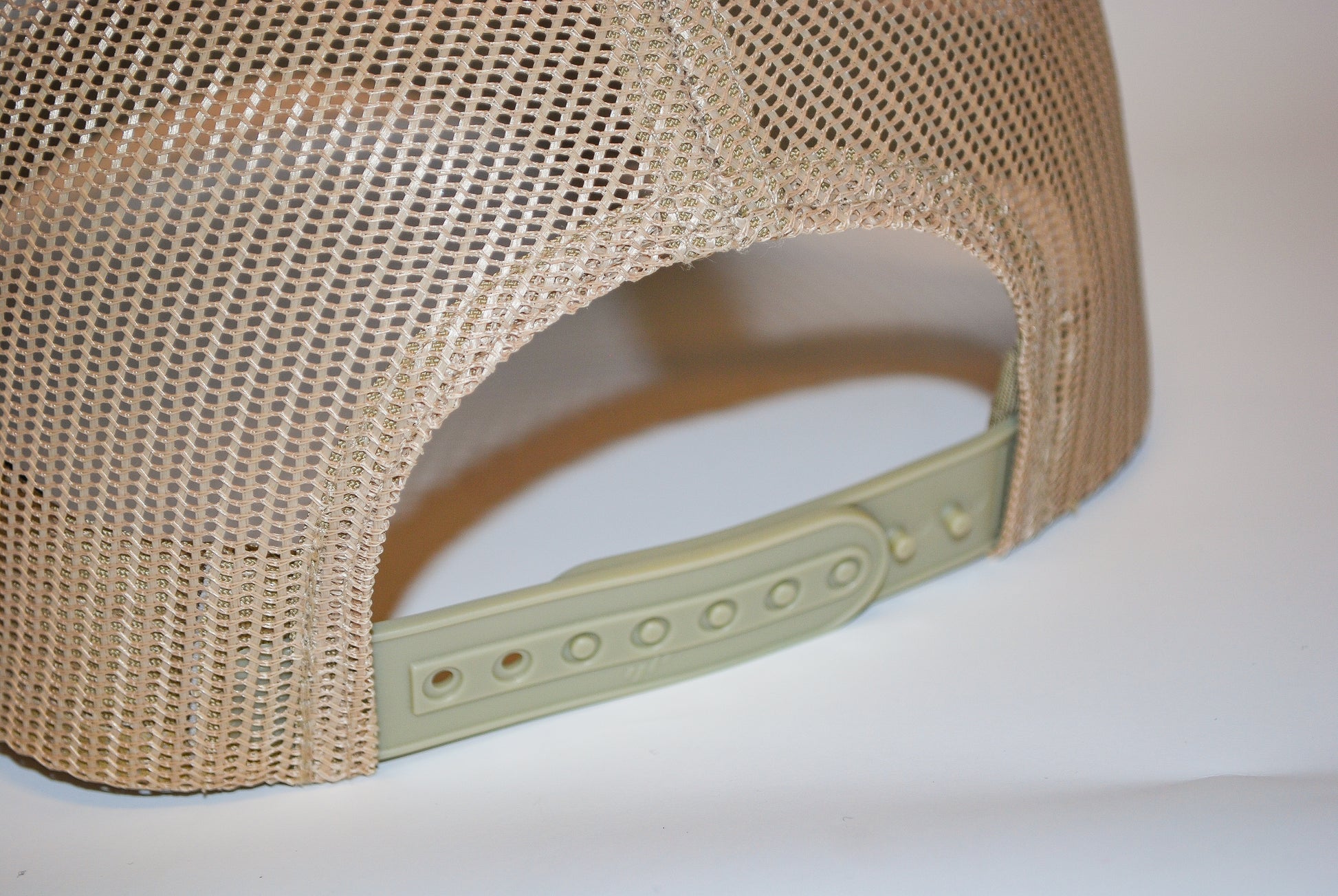 Fabric: 65% polyester, 35% cotton. Feature: 5-panel, structured, mid-profile. Eight-row stitching on bill. 3 1/2" crown. Hard buckram backed front panels. Plastic adjustable closure. Matching undervisor. Permacurv visor.